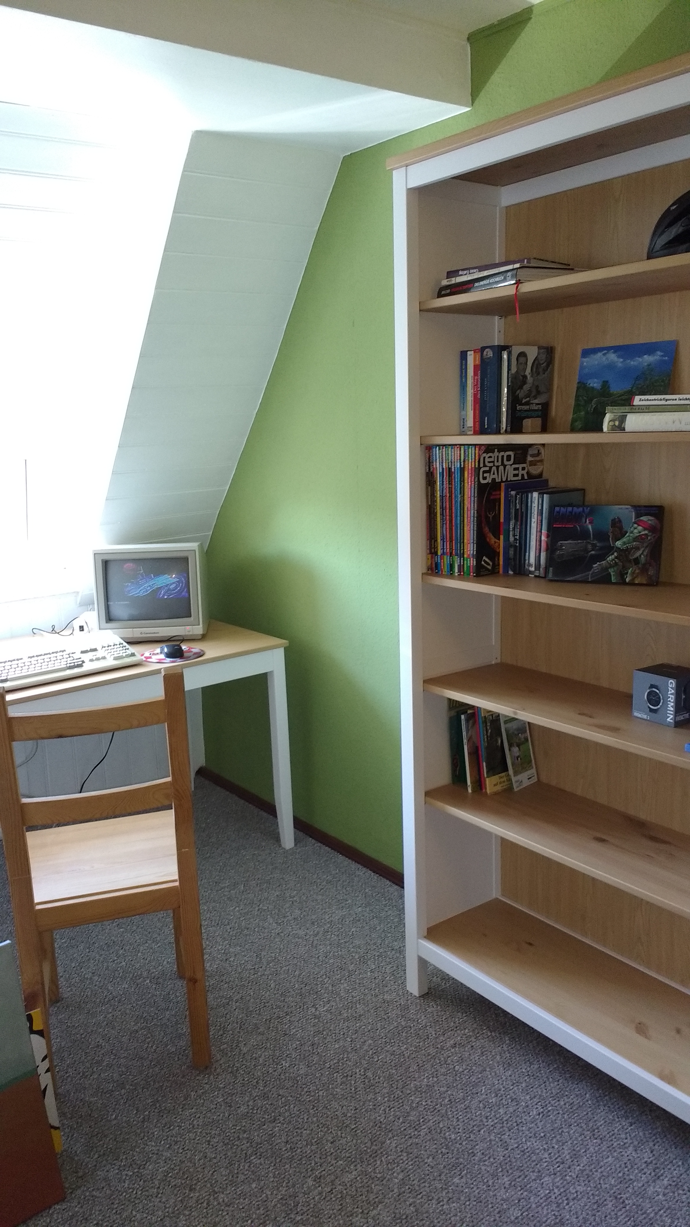 Mein grüner Retro Salon nimmt langsam Gestalt an. Regal und Tisch sind drin, seit gestern schmückt ein A1200 (Danke an Helme) den Tisch. Ich muss erst einmal wieder reinkommen, der Anfang war schon schwer und es ging nichts