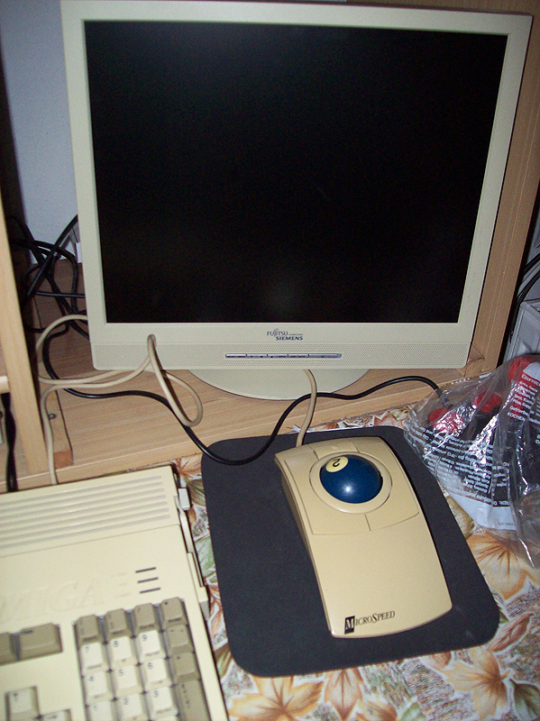 Das ist ein zusammengewürfelter A1200 mit einem Comodore-Board und einem Escom-Gehäuse. Darin werkelt eine ACA1232/42 als Torbokarte/FastRam-Speicher, und HDD mit 40GB. Rom ist Version 3.1. Die Workbenches 3.1 und 3.9 habe ich installiert. Eingerichtet ist dieser Rechner für die Nutzung einer CF-Karte oder einer Netzwerkkarte am PCMCIA-Port. Desweiteren nutze ich an diesem Rechner einen MicroSpeed-Trackball und einen Compentition-Joystick. Für die Spannungsversorgung habe ich mir ein Mini-ATX-Netzteil umgebaut. Der 15-Zoll Siemens TFT ist über einen Billig-SD/FF angeschlossen. Monitor, SD/FF und Rechner werden zentral über das umgebaute Netzteil versorgt/geschaltet.