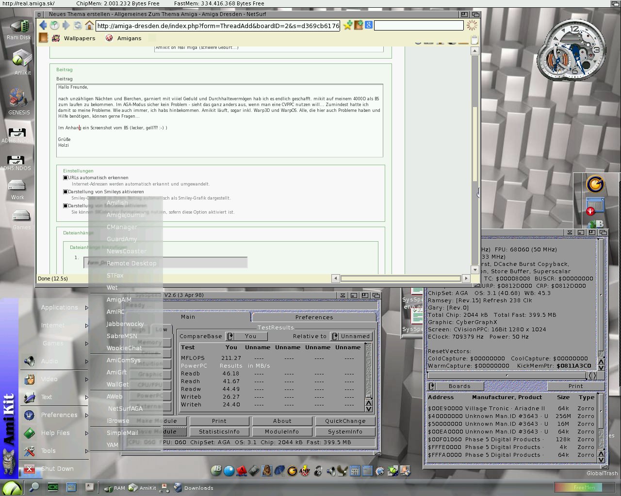 nach unzähligen Nächten und Bierchen, jedoch getrieben von eisernem Willen und mit viel Durchhaltevermögen (und Geduld von Frauchen) hab ich es endlich geschafft, das aktuelle Amikit for real Amigas auf meinem A4000D sauber und stabil zum laufen zu bekommen. Ihr könnt mir glauben - das war nicht leicht. OK, im AGA-Modus geht das recht fix. Aber versucht mal, eine CVPPC/Cybergraphx4.3 erfolgreich einzubinden und das ganze dann noch stabil zum Laufen zu bekommen. Also ich hatte damit unendlich viele Probleme. Naja, letztendlich hab ich es geschafft. Inkl. Warp3D und WarpOS Smile Wer also hier genau wie ich am verzweifeln ist/war - ich helfe gern so gut es geht. Anbei mal ein screenshot vom Amiga-Desktop... (lecker, gell? Smile )